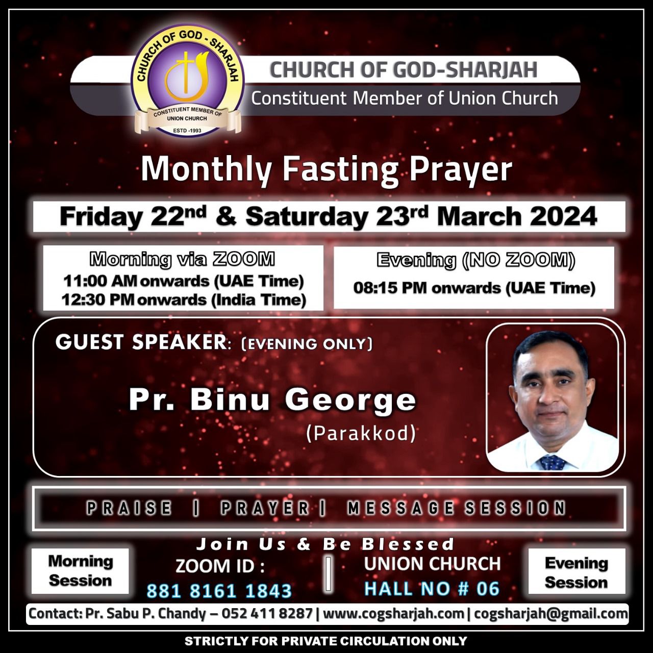 Church of God – Sharjah is under the pastoral care of Pastor Sabu P Chandy and Pastor Jose George. Our services usher in the presence of God with a genuine freedom of worship, and allow you to connect with the spirit of God in an unprecedented way. The revival happening at the Church is nothing short of miraculous.
